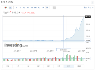 개인적으로 테슬라에 투자했다면 500%가 넘는 수익을 올렸을 텐데 제 운이 그렇게 되지 않았기 때문이죠. 기업을 분석하고 예측하는 선을 넘어선 것입니다. 테슬라 주주 여러분께서는 그냥 웃으시고 축하만 받으시면 됩니다. 하지만 그건 실력이 아니라 운이 많이 작용했어요. 테슬라 같은 종목은 10년에 한 번 나올까 말까 한 종목이라고 생각해요.