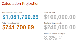 사이트는 영어로 되어있습니다만, 최근에는 한글 변환기가 매우 발달하고 있기 때문에, 변화해서 한글로 볼수도 있습니다. 현재 주식자산을 10만달러(약 1.1억원)에 연간 목표수익률은 8%로 20년간 투자합니다. 20년간 매달 1000달러(약 110만원)를 적립하는 데 투자하겠습니다. 상황에 따라 가능한 금액을 넣어 시뮬레이션을 해보면 깜짝 놀랄 수 있습니다.