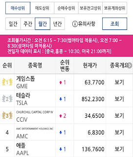 투자하시는 분들은 테슬라처럼 오를 종목을 찾으셨던 것 같아요 저는 키움증권을 사용하고 있습니다. 응용 프로그램으로 키운 증권 사용자의 상위 거래 종목이 나옵니다. 월간 상위 매수 종목을 보면 1위가 게임 스톱이에요. 1위부터 12위까지 시가총액이 높은 종목은 테슬라와 애플 정도로밖에 보이지 않습니다. 물론 시가총액이 높다고 해서 좋은 기업은 아니지만 적어도 다른 종목은 기업분석을 보면 상황이 좋은 기업은 많지 않습니다.